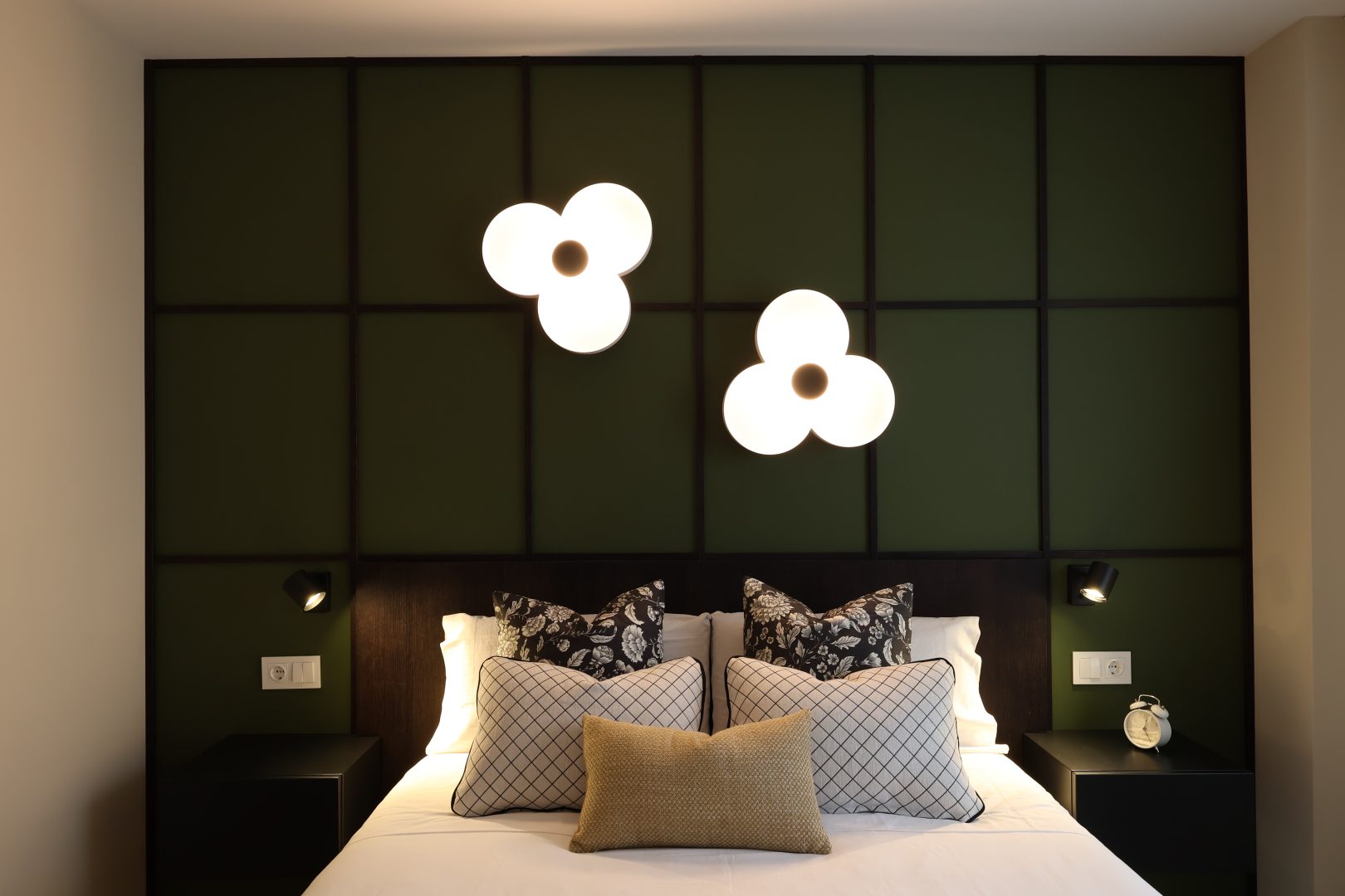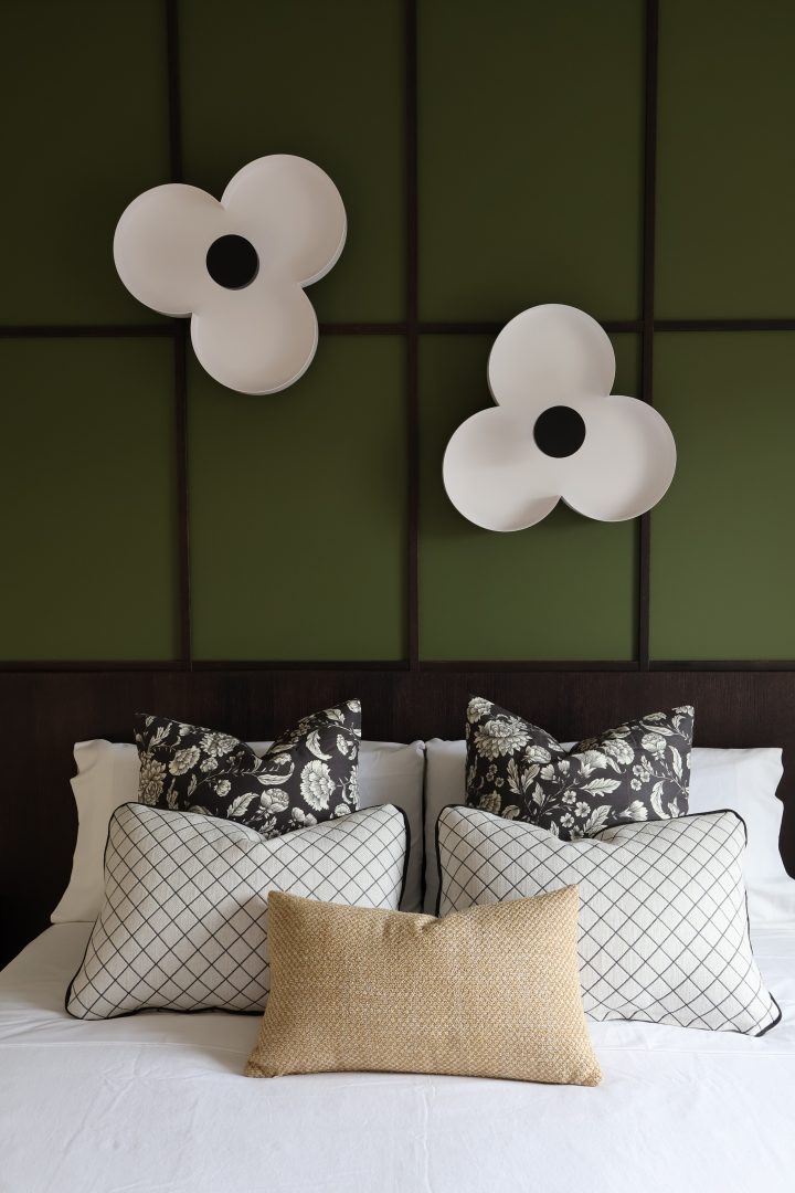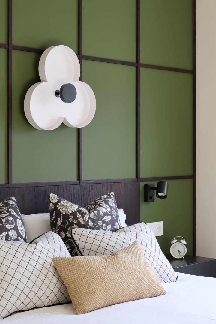 El dormitorio principal integra un cabecero con palillería en cuadrícula, evocando un tablero de ajedrez, donde los tonos verdes y mostaza dialogan con la madera barnizada oscura. Los apliques de luz, con formas florales, aportan delicadeza y una sutil nota de sorpresa, equilibrando la fuerza y la precisión de la geometría.