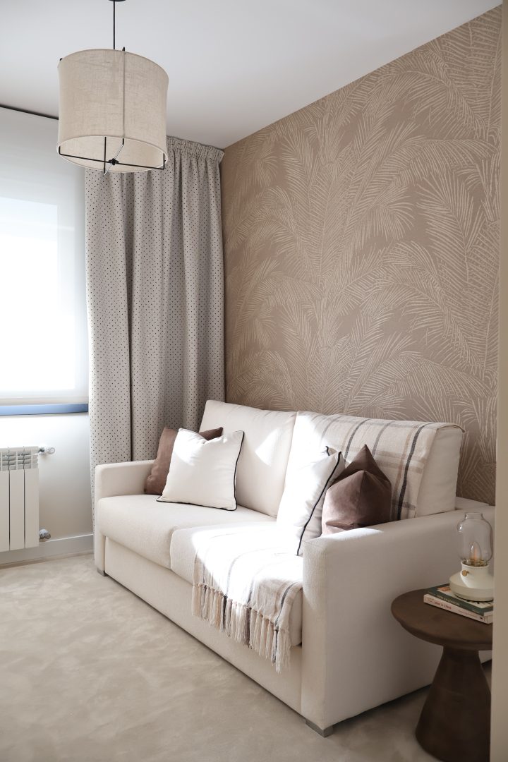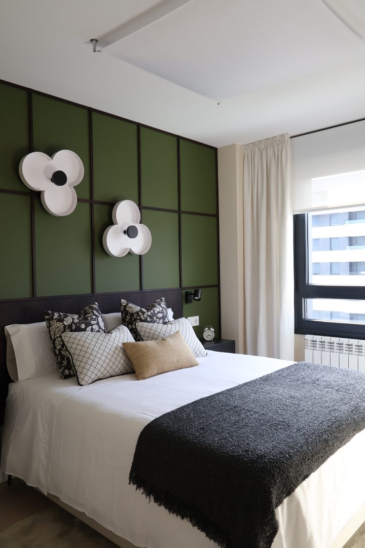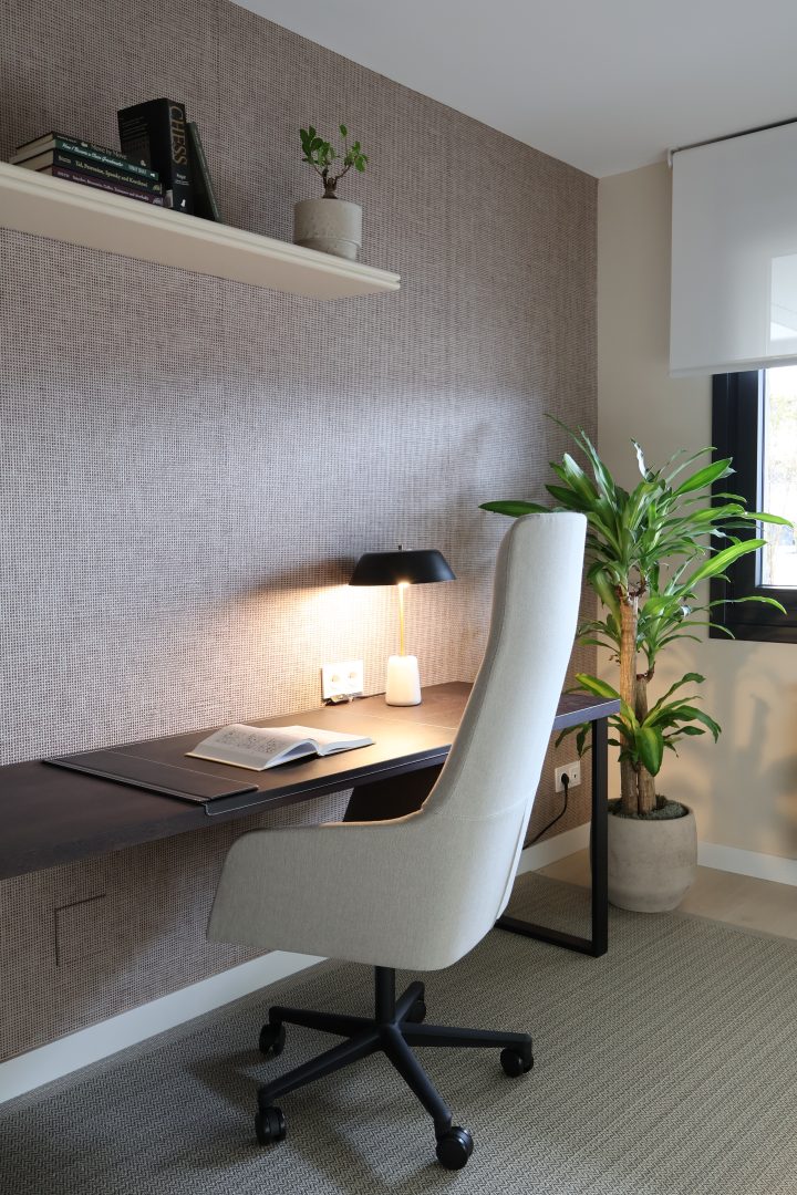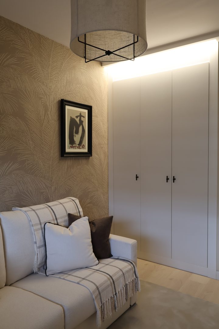 El despacho combina funcionalidad y guiños lúdicos: la cortina con siluetas de perros, la gran librería y los detalles en mármol y negro acompañan el escritorio y la silla, generando un espacio para la concentración, la creatividad y el disfrute de la lectura y el juego. El dormitorio de invitados, versátil y acogedor, mantiene esta sensibilidad mediante la combinación de estampados geométricos y vegetales, creando continuidad en la vivienda.