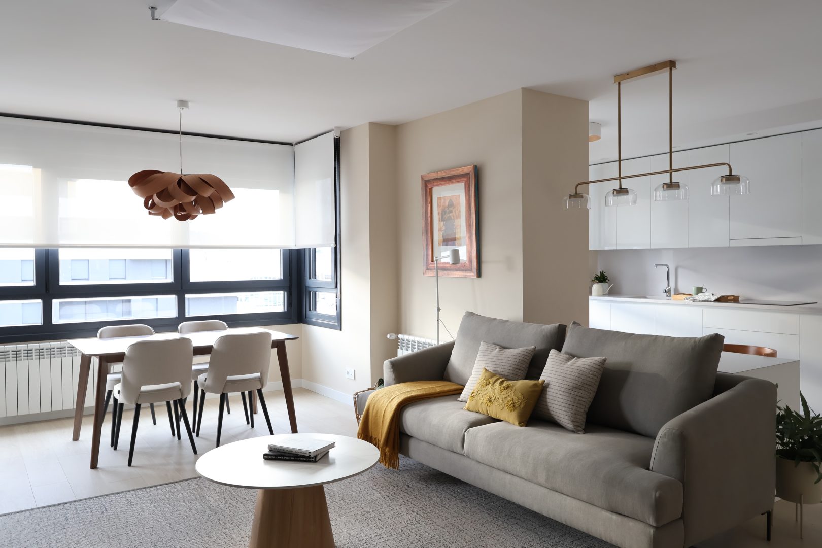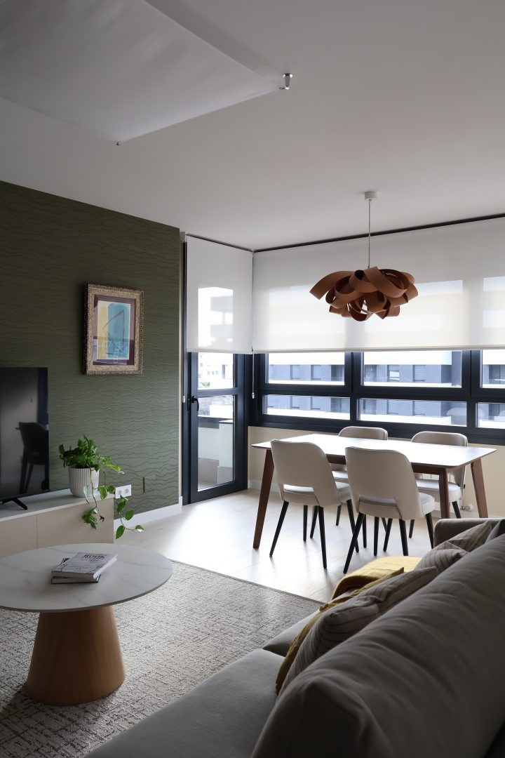 Un espacio de salón-comedor-cocina abierto se organiza con cuidado, usando el mobiliario para zonificar sin romper la percepción de amplitud. La butaca Tortuga de Patricia Urquiola con el toques mostaza y el papel de seda verde en la pared principal aportan carisma a la estancia. La luz natural, las alfombras seleccionadas y los detalles de iluminación generan una experiencia sensorial única en cada recorrido por la casa.